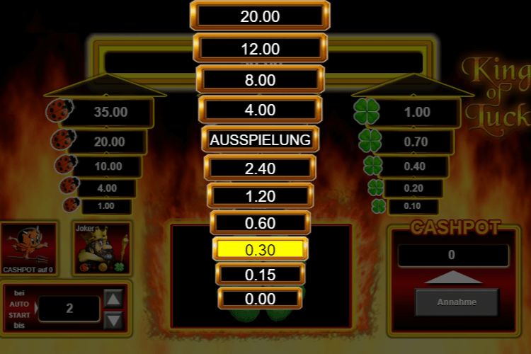 Nach der Festlegung des Einsatzes, dem Start der Drehung (auch Autoplay möglich) und einem dabei erhaltenen Gewinn können Sie selbst entscheiden, ob Sie den Gewinn weiter im Cashpot lassen oder ihn doch lieber einsammeln und somit vor dem bösen Teufelchen in Sicherheit bringen möchten. Taucht auf dem Spielfeld nämlich keines der Gewinnsymbole, sondern das böse Teufelchen auf, sind alle Gelder, die sich noch im Cashpot befinden, verloren.