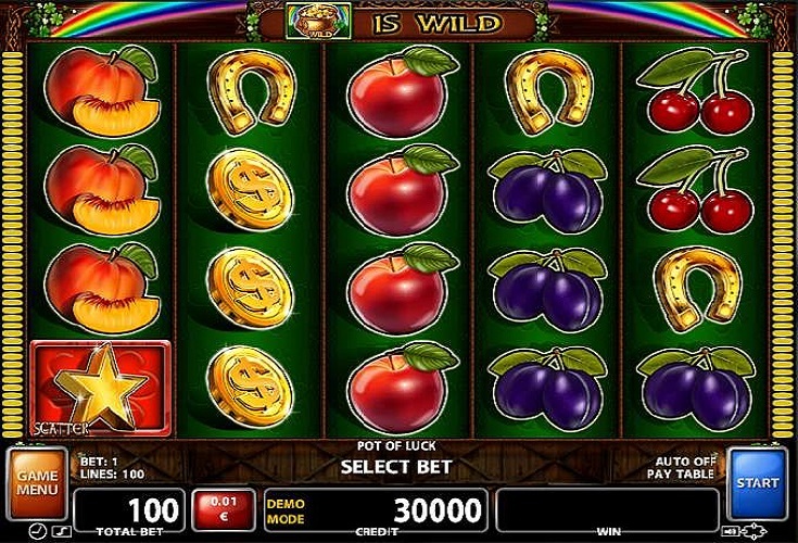 Der Pot of Luck Online Slot verfügt sowohl über Wilds (wilde Symbole) als auch über Scatter Symbole, die zu attraktiven Gewinnen führen können. Die klassischen Symbole sind Kirschen, Äpfel, Trauben, Pflaumen, eine Dollar-Münze, eine goldene Glocke sowie ein goldenes Hufeisen. Alle Symbole haben das Potenzial, abhängig von der Gewinnkombination, Auszahlungen in Höhe von 500 Münzen zu veranlassen. Zu dem am besten bezahlten regulären Symbol gehört 7.
